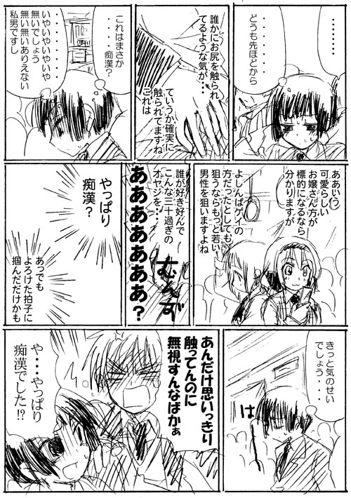 痴漢ネタで盛り上がってた時期があって描いてみた。一度やってみたかったんだけど満員電車描かなきゃいけない・・・嫌だ・・・ので諦めてたものの、何かごまかしがきいた。