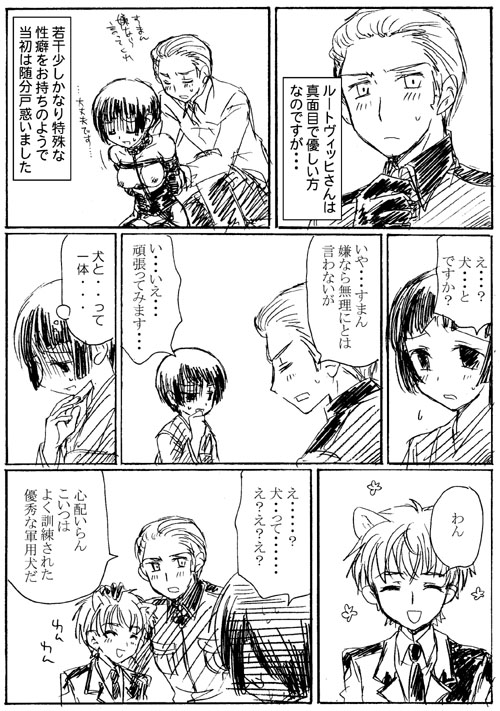 独日って堅物円満夫婦なイメージですが、あっちの方はいろいろアレだと思ってます。ルートヴィッヒさんを心の底からお慕いしてその後を三歩下がってついてくようなお菊なので、「えええ?」と思うような要求をされても可能な限り受け入れて、しかもルーイも「嫌ならいいんだ」とあくまでお菊の意思を尊重するもんだから「ルートヴィッヒさんの要望にお応えせねば」とむしろ頑張ってしまい、比較対象が無いためにいつしかそれが当たり前になって、後々アーサーあたりに夜の生活がバレて「おまっ・・・そんなプレイを・・・!!」と驚愕されればいい。