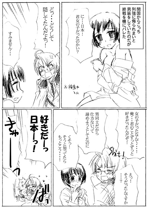 本編のお話から大分後、開国→日さん男装してがんばる→いろいろある→メリに保護されて性別バレる。