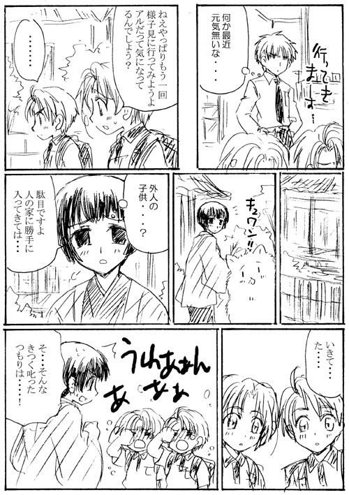 期待させてしまうと申し訳ないので、あ、あんまり発展させないんだからね!だってあくまで朝菊だし・・・と自分に言い聞かせる意味合いも含めて宣言しておきますが、描いてる本人ですらどう考えても菊はルーイとくっついた方が絶対良いよなあ・・・と思ってしまうので困ってます。ポジション的にも朝が暗黒騎士ならルーイはパラディンだもんなあ。いや、ジョブチェンジする程度の違いだから闇も光も属性的な問題以上に意味は無いんですけど。・・・・・・・・・・何の話だ。